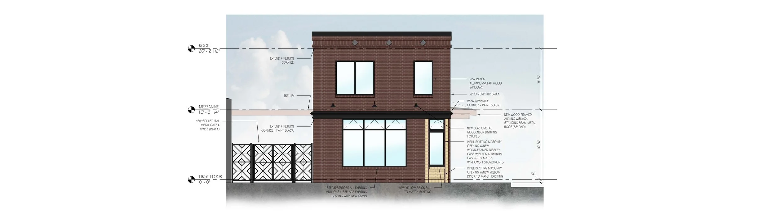 With hopes and intentions to contribute to and improve Wilmington's Quaker Hill neighborhood, the client repurposed this run- down property, which previously contained a laundro-mat, liquor store, and apartments on the second floor. Alongside Breckstone Architecture, they transformed it into a new art gallery, event space, and pop-up shop to serve the local community. The spaces are intended to provide opportunities for growth to aspiring artists and entrepreneurs in the area. They are designed to function as art galleries, communal event spaces where classes can be held, as well as temporary shops to give a leg-up to emerging local entrepreneurs.