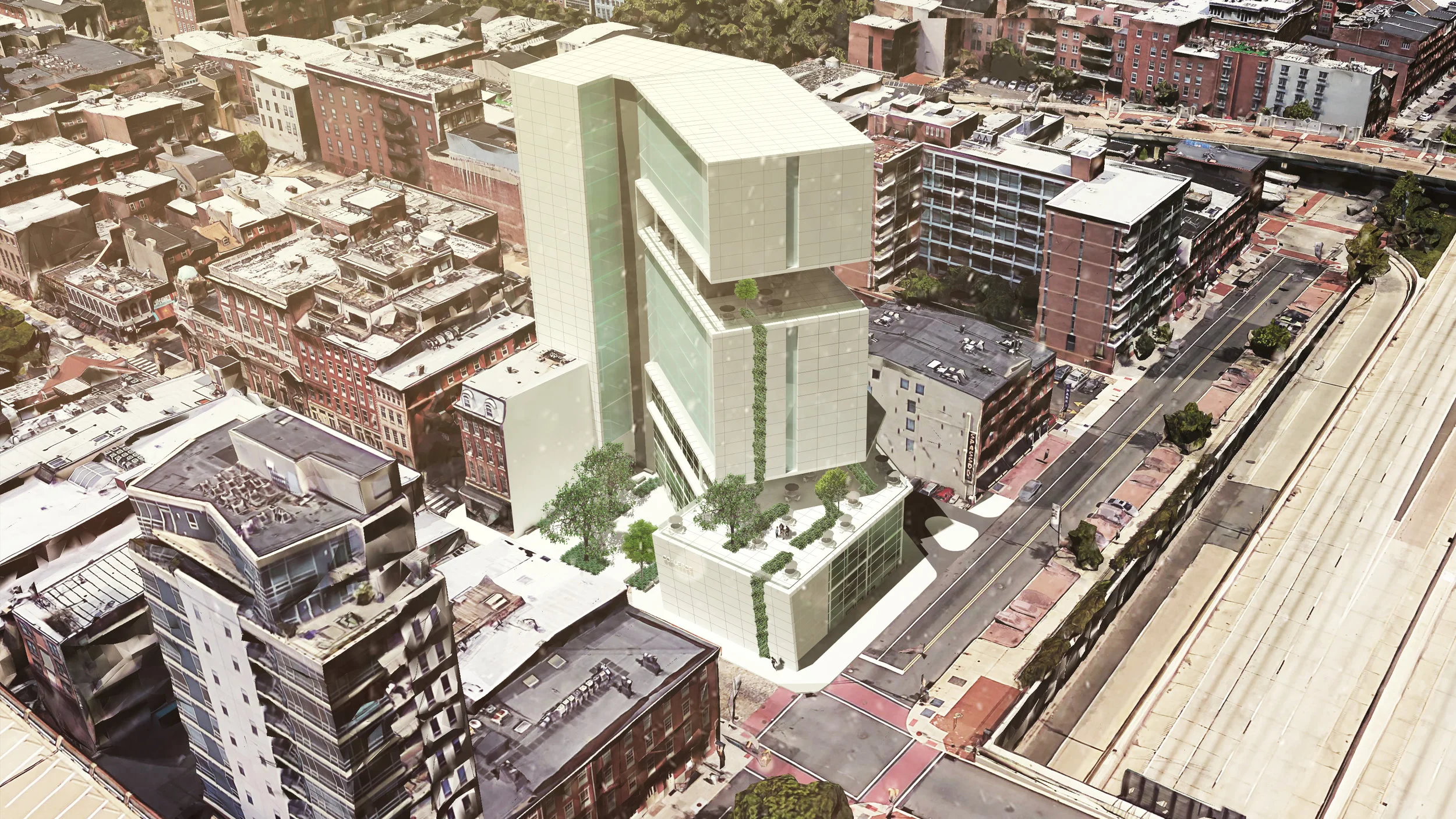 The massing of the tower allows for large views of the Delaware, the Benjamin Franklin Bridge, and the Center City skyline. 160 rooms are available for guests, all of which offer breathtaking views. Atop the tenth floor is a large public space available to local pedestrians as well as tourists. It features a restaurant on the west side of the floor, with views of the Center City skyline, and an outdoor seating area and performance space on the rest of the floor. Because it is located in the cutout of the tower, it draws attention from near and far. The large surface that ribbons through the tower unifies it with the public space below and with the general urban fabric.