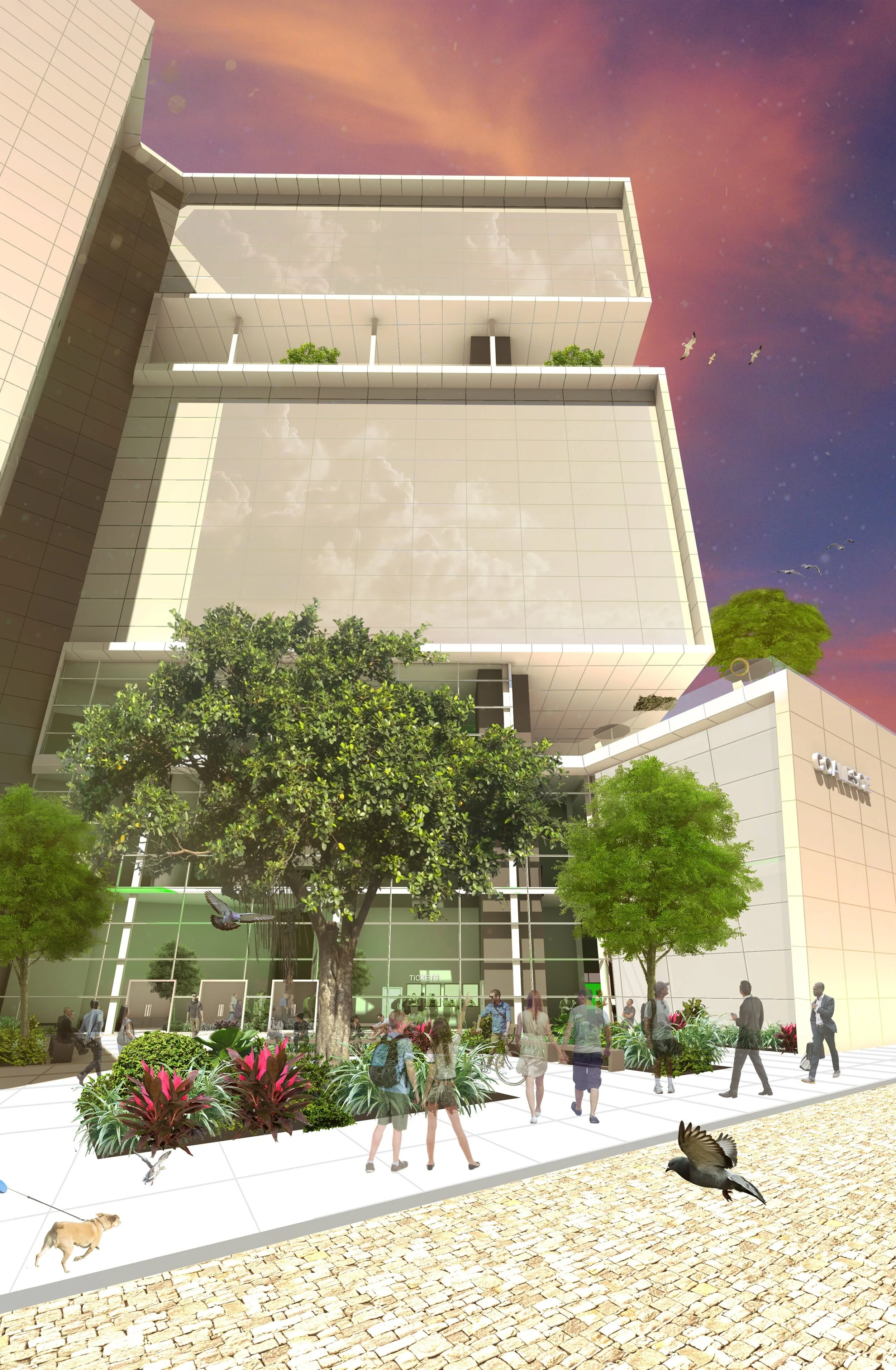 The project brief required a tower that integrates public space with the surrounding urban context and that juxtaposes it with private space. In addition, some of the public space was required to be located above ground level. To meet these requirements, a single surface ribbons through the space, linking the public spaces together while also differentiating them from the private spaces. In addition, the outdoor public spaces blend together with the indoor public spaces. Greenspace becomes somewhat synonymous with public space.
