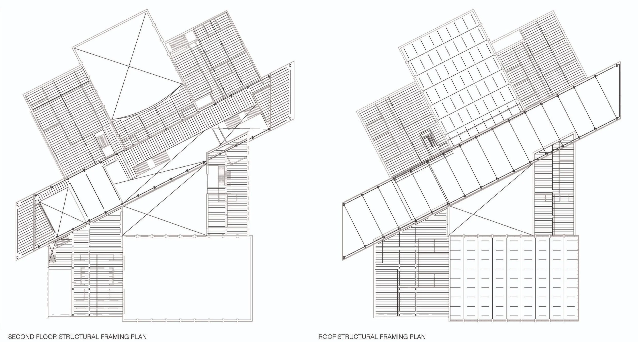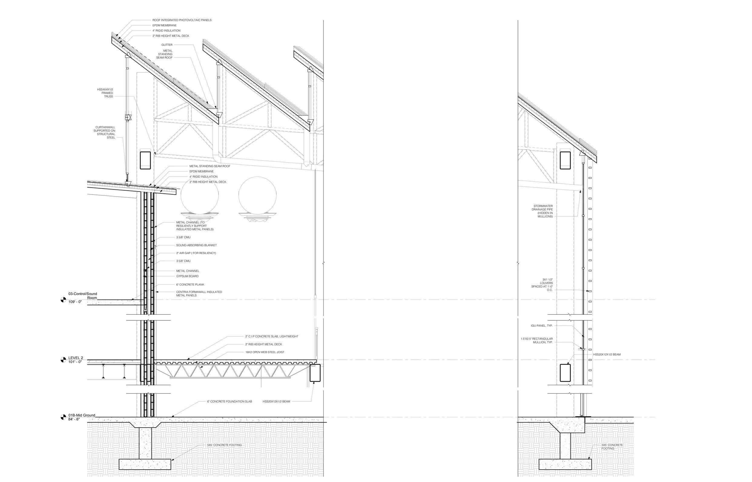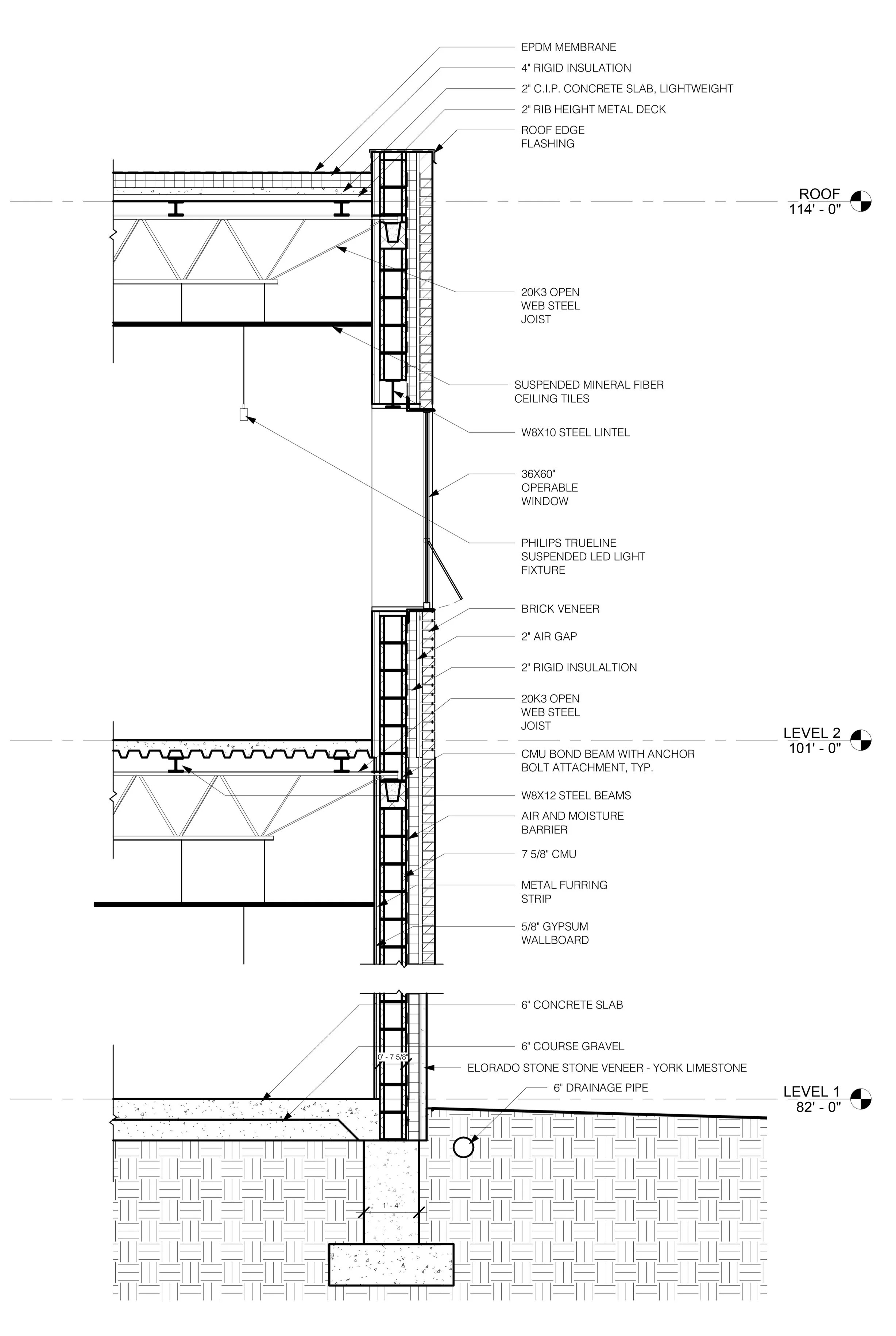 Furthermore, with the goal of meeting the Architecture 2030 energy standard, the building utilizes several sustainable design practices. Perhaps most notably, the proposal features a building-integrated photovoltaic array for which the spine has been rotated at a 30-degree angle to the East-West axis of Philadelphia’s city grid. The sawtooth roof serves as an integrated approach to orient the panels for optimal collection of solar energy as well as to let in diffuse light from the north. It is both a diagrammatic statement as well a functional element, facilitating circulation and cultivating community.